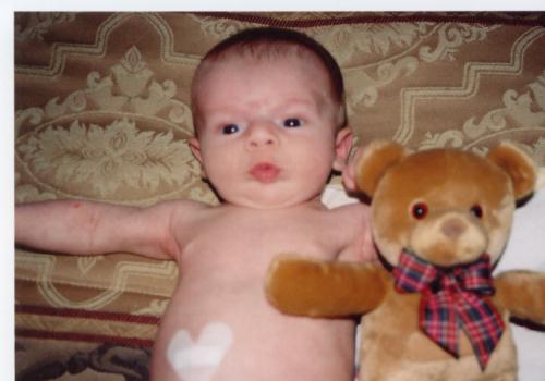 Me and Boo-Boo Bear! See my heart bandage over my PS surgery boo-boo? My bear has one too. We look alike, don't you think?