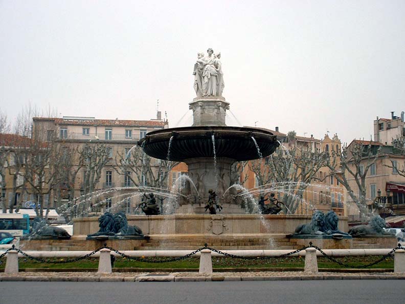 This is the fountain at the Rotunde in Aix. We thought it looked beautiful with the pruned plane trees and colorful buildings in the background.