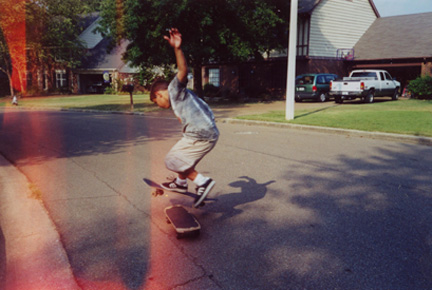 Fwoa! It's Jason's friend Paul in Germantown! Paul, we forgot we had this photo of you doing a 360 ollie with a half pipe grind! Actually, I don't know what it's called but those are the only skateboard terms I know <g> it looks pretty impressive ay?