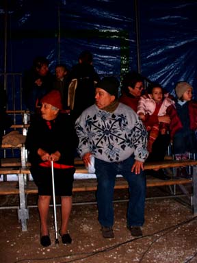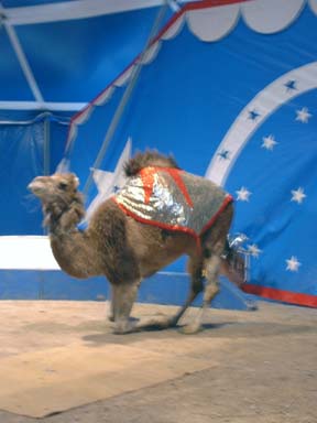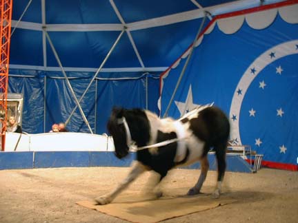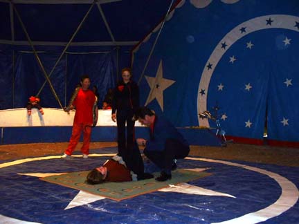 This girl was a volunteer from the audience. The ringmaster surprised her by shoving one of the snakes under her shirt! She lay very still like he instructed until it crawled out of her sleeve .. then she shuddered vigorously as she walked off stage!