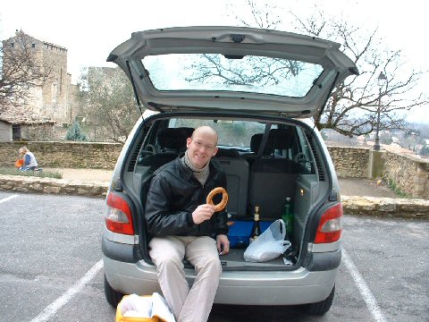 This curious round thing (no not my head), is called a Brossolade and is made there in the village of Bollène and is flavored with orange rind. Sounds a lot better than it is. This is how to have a picnic when it is 37 degrees out.