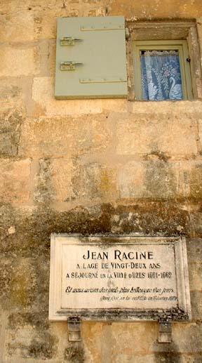This plaque says "Jean Racine - at the age of 22 years, he came to the village of Uzés 1661-1662 and we had nights more beautiful than your days." I keep meaning to look up info on this Jean Racine and see what makes him so special!