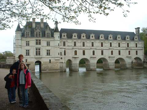 On the way to Normandy, we stopped in the Loire Valley for the night. We took advantage of the chance to see 3 of the most famous châteaux in France. Here are the kids at Chambord, "hunting lodge" to several kings who all tried to outdo each other in architectural detail. This château is the largest of the Loire valley with no less than 440 rooms and 365 open fireplaces. Most of the furniture was looted during the Revolution.
