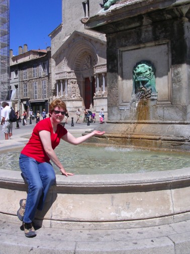 Christine at the fountain on the square in Arles. St. Trophime