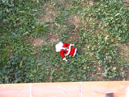 It's Santa! Supposedly, his arms move, he's holding candles, his head rocks from side to side and he plays music. When we rescued him his arm was broken, he was candle-less and he gurgled intstead of playing music. Jonathan operated on him and he works now ... the kids were thrilled! Kept it. When I opened the door and saw this sight, I couldn't help but think of the movie The Santa Clause with Tim Allen. Remember Santa falling off the roof?!